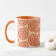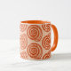 Mugg i ett tryckt block, mönster, baserat på ett årstidsskal för spiral, i djupkorall orange på en orange av pastellkorall/aprikobakgrund
