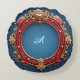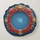 Lyxig cirkulär ram med förgylld, invecklad kant med röda hjärtformade ädelstenar, pärlor och gyllene blommor. Rik blå och karmosinröd bakgrund frammanar romantik, elegans och tidlös firande perfekt för lyxdekor eller smycken.