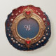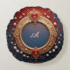 Luksuriös cirkulär ram med förgylld, invecklad kant med röda hjärtformade ädelstenar, pärlor och gyllene blommor. Rik blå och karmosinröd bakgrund frammanar romantik, elegans och tidlös firande perfekt för lyxdekor eller smycken.
