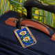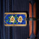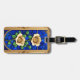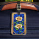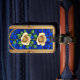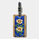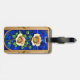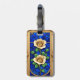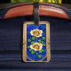 En elegant framställning av en gyllene ros omgiven av en dekorativ ram med invecklade detaljer. Den rika blå bakgrunden framhäver den slående kontrasten och den lyxiga känslan i designen.