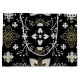 Utsmyckat svart och vitt blomster mönster med förgyllda accenter. Centralt symmetriskt blommotiv omgivet av bladmotiv och invecklad grenstruktur. Elegant, dekorativ design.