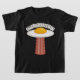 Tecknad av vektor illustration av en utsökt solig sida uppåt av frigjort ägg UFO med en gul bacon slice-traktorstråle med EGGSTRATERRESTRIAL text. Nyckelord: ägg, bacon, frukost, UFO, utomjording, solig, tecknad, rymd, utomjordisk, mat, söt, yolk, sci-fi, vetenskap, fiktion, martik, humor, kött, gris, bortförande