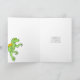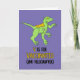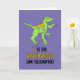 Säg till vänner att du är lycklig att de vaccineras med den här häftiga dinosauren. Det här hälsningskortet illustrerar en velociraptor i klar grönt med ett förband på arm där han har sin bild ovanför meddelandet "V är för vaccinerad (och Velociraptor)" mot en lila bakgrund. Det inre meddelandet är redo för anpassningsbarnas beröring
