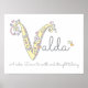 Söt V monogramkonst namn poster perfekt för ett flickors sovrum eller lekrum i nyans av grått, vitt, gult, rosa och lila. Personalisera med ditt barns egen namn från och med V, och namn som gör att personligen kan röra ditt barns sovrum eller daghem, så är detta exempel för namn V Valda A-härskaren. Ner till jorden och raka samtal. Cute poster utskrift som passar perfekt för en nyfödd bebis-, ristening- eller babyduschpresent. © Unique V monogram hearts and blommor teckning Description and Graphics Art Design by Sarah Trett. www.sarahtrett.com för www.mylittleeden.com