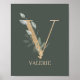 Brev V monogram blommigt. Brev V i guldbrun struktur accentuerad med grönt vattenfärgade löv, blommor och blommar från guld. Personlig med namn i matchande teckensnitt.
