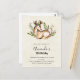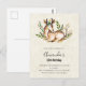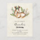 Födelsedags inbjudan i form av vykort med en vacker hjort som ligger ner omgiven av lummig flora. Design i rustik Boho-stil.