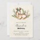 Födelsedagsinbjudan med en vacker hjort som ligger ner omgiven av lövrik flora.
