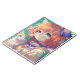 Vacker Anime-flicka med två blå ögon som håller en bedårande kattunge. Färger som används är rosa, turkos, orange, blå, lila och blå. Söt och färgglad barn-AI-konst. generativt innehåll