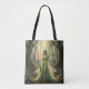 En vacker älv med en blomande ljust grönt klänning och smycken av peridoter med peridot-stenar i sitt långa ljust grönt hår och genomskinliga drakonflukliknande vingar som håller en gladiolus går i en magisk skog omgiven av rosa och blåa blommor och vintäckt träd.