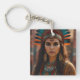 En kvinna med piercing mörk ögon startar direkt vid tittaren, hennes ansikte med en strålande hög av turkos och orange fjädrar. Hon är adorerad med krånglig smycken: ett belagt huvudband med en centralkalksten, stora ludderörringar och lagrar av halsband av pärlor, fjädrar och metallverk. Hennes uttryck är allvarligt, hennes gaze orubbligt, och förmedlar en känsla av styrka och visdom. Bakgrunden är suddig, vilket tyder på en naturlig miljö och betonar kvinnan som fokus.