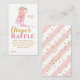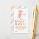 Blöja lotteri lott för baby shower med illustration av en vacker ballerina som sitter med blommor ovanför huvudet och en delikat fågel som ger henne en till blomma. Baksidan har vattenfärg vita och rosa ränder och ett stänk av gyllene glitter.