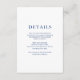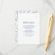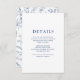 Vacker blå och vit bröllopsgästinformationskort med vackra illustrerade blommor och klassisk typografi. Baksidan är ett vackert romantiskt blommigt mönster.