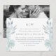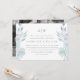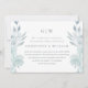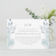 Enkel och vacker luftig blå blommig och löv med klassisk typografi ändra datum bröllopsuppskjutande meddelande har en fullständig bild på baksidan av kortet. Detta eleganta meddelande är ett chic sätt att låta inbjudna gäster veta att datumet för ert bröllop ändras på grund av oförutsedda omständigheter.
