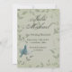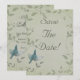 Vacker målning av en blå skogssångare som flyger uppåt placerad på en mjuk askgrön fläckig bakgrund med eleganta bladrika vinrankor. Stick ut från mängden med detta vackra och eleganta unika bröllopskort för att spara datumet. Designen ges en falsk tygstruktur för effekt. Denna bröllopsdesign för att spara datumet finns också på många andra brevpapperprodukter för att passa alla dina behov för bröllopsset.