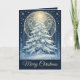 Vacker blå julgran snö och stjärnor helgkort