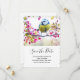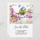 Spara datumkort med en fantastisk bild av den söta lilla fågeln som sitter på en gren täckt med rosa blommor och gröna blad. Fågeln har ett blått huvud och gul kropp med en mycket söt ansikte. Bedårande.