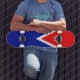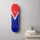Vacker blå röd och vit skateboard. Tre vita fjädrar symboliserar glädje, fred och ljus!