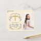 Tacka din familj och vänner för att de var med på din dotters första kommunion genom att skicka dem ett tackkort med foto från första kommunionen. Detta tackkort för kommunion har ett vackert gyllene kors med en gyllene ram mot en mjuk gul bakgrund i smörkrämnyans. En bukett vackra persika- och blåa akvarellblommor är placerade i varje hörn. Lägg ett foto av ditt barn på framsidan och skriv ett förtryckt personligt meddelande med en signatur på baksidan för din bekvämlighet, samt din returadress.