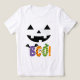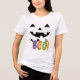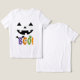 En vit t-shirt med en lekfull och festlig Halloween-design. I mitten finns en orange jack-o’-lanternleende med svarta utskärda trianglar för ögon och näsa. Nedan står ord "BOO!" i stort brev. Varje tecken dekoreras unikt för att representera olika Halloween-symboler - ett fladdermus vinge för "B", ett spooky spöke ansikte för "O" och en orange pumpa mönster som fyller ett annat "O". Utformningen fångar själva kärnan i Halloween-roligten och kan bäras som en del av en avslappnad helgdag eller som en del av en enkel kostym.