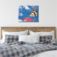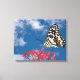 Ett nära foto av en färglös fjäril matande på en blomma mot blå himmel bakgrund.