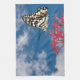 Ett nära foto av en färglös fjäril matande på en blomma mot blå himmel bakgrund.