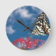 Ett nära foto av en färglös fjäril matande på en blomma mot blå himmel bakgrund.
