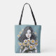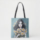 Illustration av en vacker brunett kvinna med vita tusenskönor på en teal bakgrund