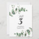 Vacker delikat elegant budget eukalyptus blad bröllopsbord nummer design. Modern elegant trendig krysantemum grön, svart, marinblå och vit stilren samtida rustik samling. Perfekt för vår, sommar, höst eller vinter bröllop.