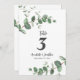 Vacker delikat elegant budget eukalyptusblad bröllopsbord nummer design. Modern elegant trendig ljusgrön, svart, marinblå och vit stilren samtida rustik samling. Perfekt för vår, sommar, höst eller vinter bröllop.