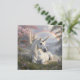 Ett sött magiskt sagotema tom brevkort. En vacker enhörning med ett gyllene horn och ögon sittande under en regnbåge nära ett slott.