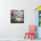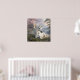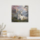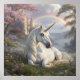 En söt magisk sagotema-poster väggkonst. En vacker enhörning med ett gyllene horn och ögon som sitter under en regnbåge nära ett slott.