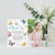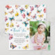 Vacker fjärilsflicka födelsedagsfoto tackkort. Designen har en klassisk vit bakgrund med en mängd färgglada akvarellfjärilar som ramar in ett elegant anpassat födelsedagsmeddelande och ett fotografi av födelsedagsflickan!