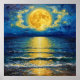 En naturskön vy av en lysande fullmåne som belyser havsvattnet med livfulla reflektioner, omgiven av en stämningsfull molnig himmel, som fångar skönheten i en lugn natt.