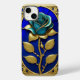 Elegant glaskonst med en livfull blå ros inramad i en detaljerad geometrisk ram med utsmyckade mönster. Ett fantastiskt exempel på konstnärskap och hantverk för dekorativa och inspirerande syften.