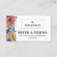Färgglad blommig rekommendationskort med blommor i korall, rosafärgad, blå och gul och ditt företagslogotyp på ena sidan och en mjuk ljus korallrosa bakgrund på den andra sidan där du för hand kan skriva namnet på den nya klienten och namnet på den refererande klienten. Iögonfallande livfull "rekommendera en vän"-kort personifierad med din logotyp, och tryckt med massor av handritade fantasifulla blommor och charmiga typsnitt. Personlig rekommendationskort med logotyp och folkliga blommor i gul, korall och blå för din salong, skönhetssalong, småföretag. Personlig "rekommendera en vän"-kort för småföretag med en vacker blommig design inspirerad av folklig fantasi och sommarängsfärger.