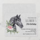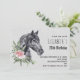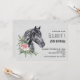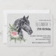 Födelsedagsinbjudan med en vacker illustration av ett svart hästhuvud med en fin blomsterdekoration vid halsen. Elegant och klassisk djurmålning. Grå fläckig bakgrund.