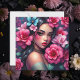 Ett blankokort med en latinsk eller latinsk kvinna med söt rosa och blåa blommor i håret. En fantastisk digital aj-konst.