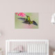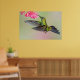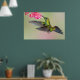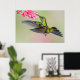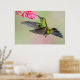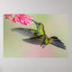 Skriv ut med en vacker grönt-krökt briljant hummingbird som flyger till en rosa blomma i Costa Rica, med fjädrar från vingar och svan utspridda och hans iridescent grönt fjädrar mousserande. Fisk dekoration för fågel, trädgård och hummingbird älskare. Foto taget vid Bosque de Paz Reserva Biologica, Valle del Rio Toro, Alajuela, Costa Rica.