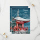 Denna inbjudan från bröllop spara datum fångar Japans skönhet. Den har en vacker blå bakgrund med ett målat japanskt buddistiskt tempel och grön.