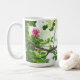 En snygg kaffemugg för alla som är intresserade av fåglar! Foto av en vacker röd hanne av nordkardinal som poserar i en blommande lagerströmia.