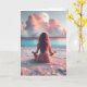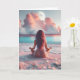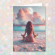 Vacker kvinna mediterar på en strand av vit sand och blankt havsglas. Rosa och blå fluffiga moln och blekt blått vatten.
