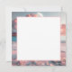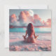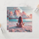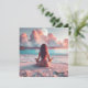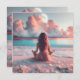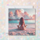 Vacker kvinna mediterar på en strand av vit sand och blanka havsglas. Rosa och blå luddiga moln och blekt blått vatten.