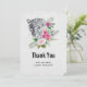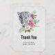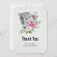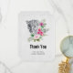 Tackkort med en vacker illustration som visar ett grått, svart och vitt leopardporträtt. Denna älskvärda djur omges av en tropisk blomsterbukett. Elegant, exotisk och älskvärd.