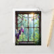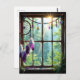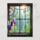 Ett vackert vykort för att säga hej och hålla kontakten med en vän eller familjemedlem. Ett rustikt fönster med en lila fjäderdrömfångare som hänger i fönstret tillsammans med färgglada gnistrande kristaller. Fönstret blickar ut över en vacker samling träd och solstrålar som lyser genom.