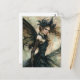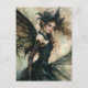 Vacker älva iförd en mörkgrön och svart klänning, hon har vackra svarta spetsvingar, långt flödande hår, spetsiga öron och mörkgröna fjädrar i håret.