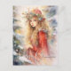 En halokrans av hull och bär på hennes huvud, denna söt julfairy i en blommande röd rob, står i snö och har ännu inte dekorerats Julgran
