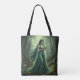 En vacker älv med en blomande grönt klänning och ett halsband som är gjort av larver med bläda petaler i hennes långa grönt, och ett ljust grönt drakliknande vingar med ett liljum-of-valley-stativ i en magisk skog omgiven av blått och gula blommor, liljor-of-valley och motäckt träd.