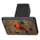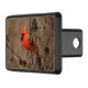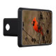 Fantastisk röd fågel i grenar på en död eller fallande träd med brunt löv. Bakgrunden gör att fågelfjädrarnas ljusröda färg står ut och faller.