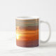 En vacker panoramisk vision av en havssolnedgång med blå himmel, orange moln och en ljus gult sol som glöder över havshorisonten.