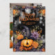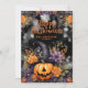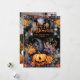 Foto Happy halloween-kort med en leende pumpa med svart häxhatt och lila- och orange blommor. Anpassa det här Halloween-kortet enkelt med ditt foto och familjen namn.